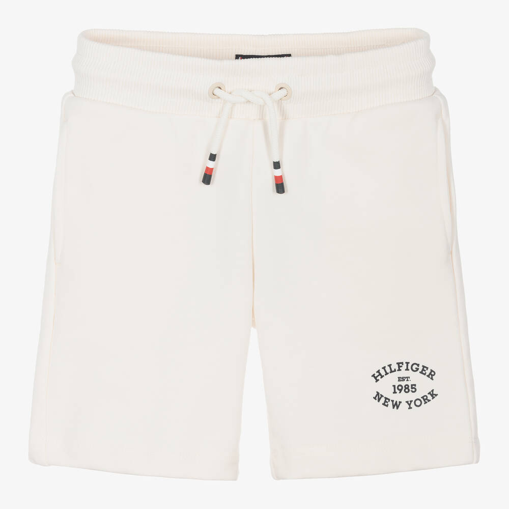 Ivory shorts for boys by Tommy Hilfiger, made in a mid-weight cotton jersey blend for comfortable wear. These casual shorts are easily adjustable with drawstring ties, tipped with the brand's signature colours of red, white and navy blue. They have concealed side seam pockets to carry small essentials. There is a varsity-inspired logo print on one leg and iconic flag embroidery on the back patch pocket. This product is made with at least 50% organic cotton.