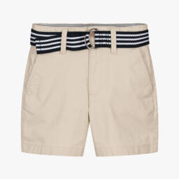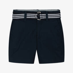 Navy blue chino shorts for boys by Tommy Hilfiger, made in soft cotton twill with a hint of stretch. Great for smart or casual wear, they are styled in a comfortable, relaxed fit, with useful pockets and an adjustable waistband. A small flag logo is embroidered on the back for a signature finish. The shorts come with a striped, webbed belt to complete the look.