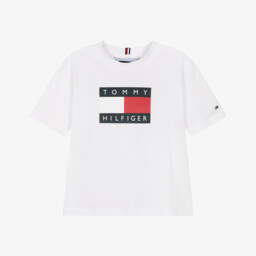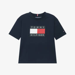 Navy blue cotton T-shirt for boys by Tommy Hilfiger, featuring the brand's iconic Heritage Flag logo on the front for instant designer appeal. This casual tee is made in soft jersey and styled with a classic crew neckline and short sleeves.