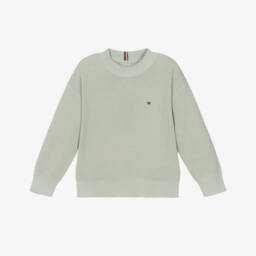 Navy blue sweater for boys by Tommy Hilfiger, made in a soft cotton knit. This warm jumper has a textured finish and ribbed trims for extra cosiness. The iconic flag logo is embroidered on the chest, and the brand's signature tricolour tape is on the back of the neck for instant brand recognition.
