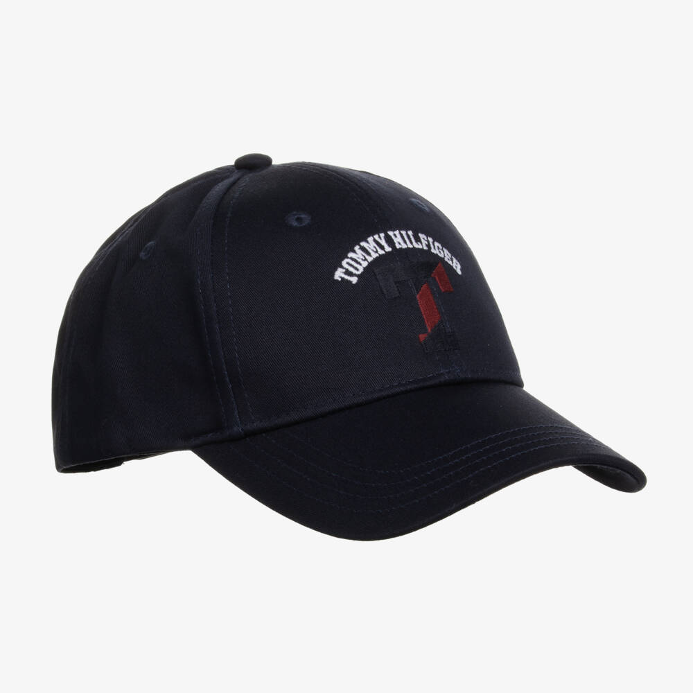 Boys navy-blue cap by American designer Tommy Hilfiger. Made in soft cotton twill, it has a peak to help improve visibility in the sun and an adjustable strap for the ideal fit. Embroidered on the front is a navy blue and burgundy red varsity monogram logo, with white lettering above. This product is made with at least 95% organic cotton.
