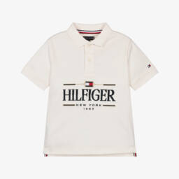 Navy blue long-sleeved polo shirt for boys by Tommy Hilfiger, showcasing the brand's iconic style. Made in soft organic cotton jersey, it features contrasting white stripes on the sleeves and a bold logo design on the back for a sporty look. There is short button placket and a small flag logo on the chest for a signature finish.