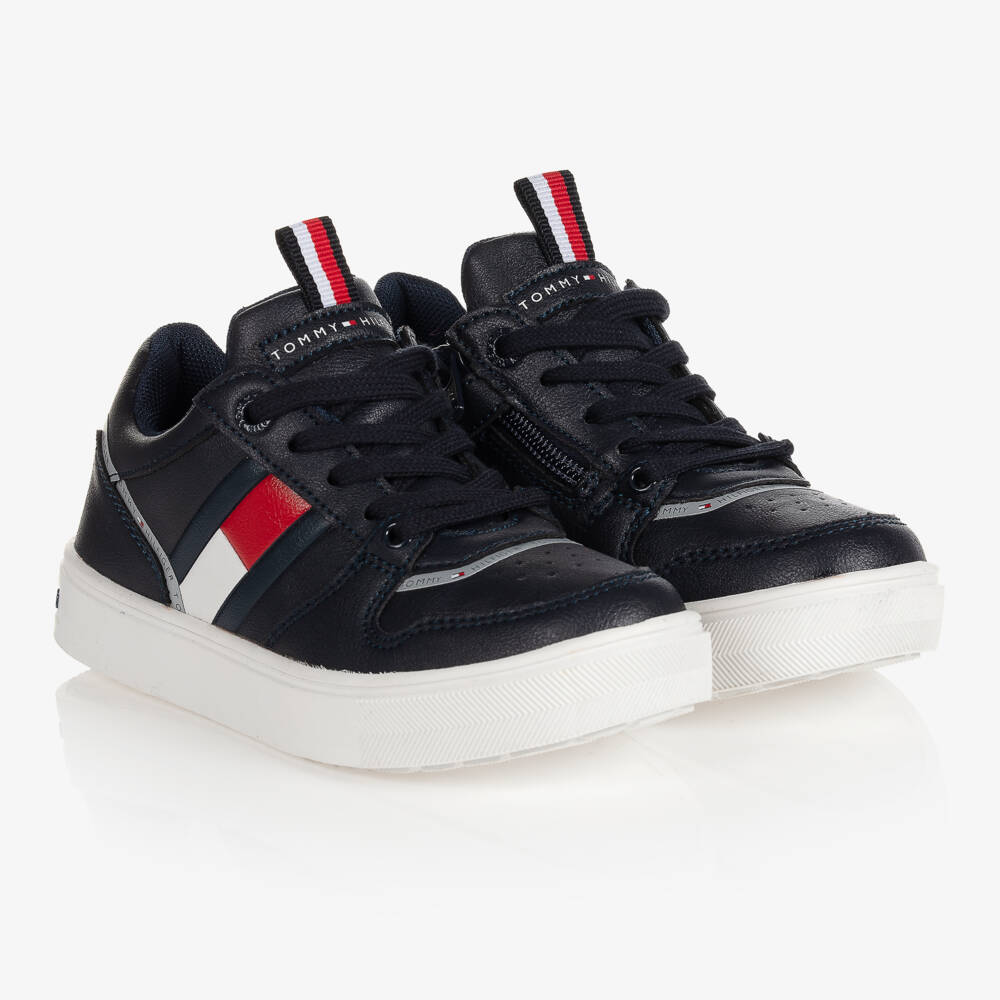 Boys navy blue faux leather trainers by Tommy Hilfiger, with multiple logo branding in the brand's iconic red, white and navy blue throughout the design. Lined in soft mesh fabric, they have pebble-cushioned insole for extra comfort. There are laces and a side zip to fasten, and the outsole is made in non-slip rubber.