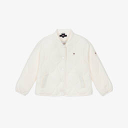 A navy blue jacket for boys by Tommy Hilfiger, gently padded for warmth and comfort. This practical style has useful pockets on the front, elasticated trims and a fixed hood that can be neatly packed away in the stand-up collar. Fastening easily with a zip, it has a striped, branded lining and a flag logo on the front and sleeve for a signature finish.