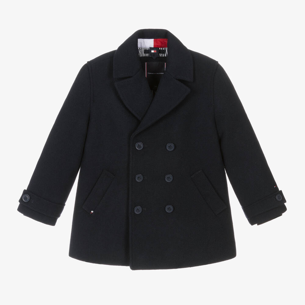 Warm navy blue peacoat for boys by Tommy Hilfiger, made in a lightly padded, wool-blend twill. In a classic style, it has a revere collar and double-breasted, branded button fastenings. There are ribbed cuff inserts for extra cosiness and useful, popper-fastening front pockets, one with a tricolour logo tab. The silky lining is striped in white and blue.