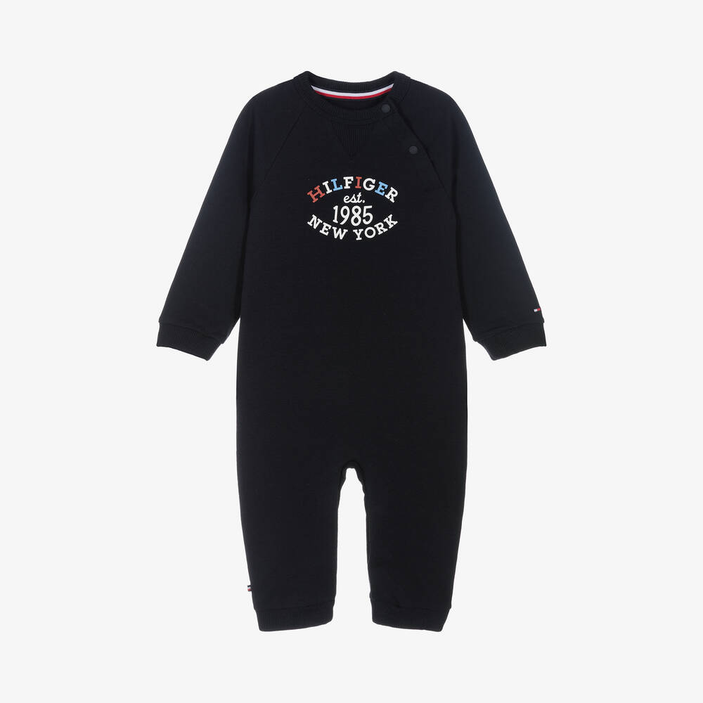 Cute and comfortable for baby boys, a navy blue romper from American brand Tommy Hilfiger, made in soft cotton jersey. It is casually styled with stretchy ribbed trims and has a varsity-inspired logo print on the front in white, red and blue for a distinctive designer touch. There are branded popper fastenings on one shoulder seam with further poppers between the legs for easy changing.