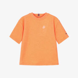 Pale blue ribbed cotton jersey T-shirt for boys by Tommy Hilfiger, with an embroidered script logo in orange. It is made in a comfortable, relaxed fit for casual days.