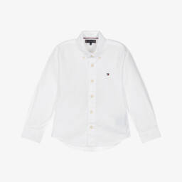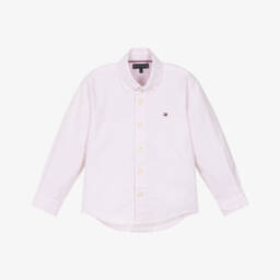 Pink Oxford shirt for boys by Tommy Hilfiger, with the brand's signature flag logo embroidered on the chest and a button-down collar for a smart casual look. This classic style is woven in soft organic cotton with branded button fastenings. For a signature finish, tricolour stripe buttons accent the cuffs with matching trim along the side seam.