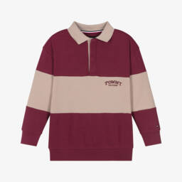 Boys red stripe rugby shirt by Tommy Hilfiger. This preppy style has a contrasting chambray collar and classic knit design. The iconic tricolour flag is embroidered on the chest for designer appeal.