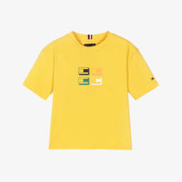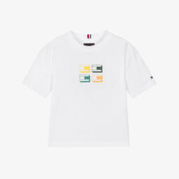 White T-shirt for boys by Tommy Hilfiger, made in soft cotton jersey. In a comfortable crew neck style, this casual tee has a 3D flag graphic design on the front in yellow, green, and orange. A small flag logo is embroidered on one sleeve for a signature finish.