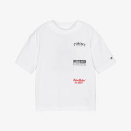 A white T-shirt for boys by Tommy Hilfiger, made in soft cotton jersey for comfortable wear. This casual top has a cool logo graphic printed in pink, purple and blue gradient shades, on both the front and back. A small flag logo is embroidered on one sleeve for a signature finish.