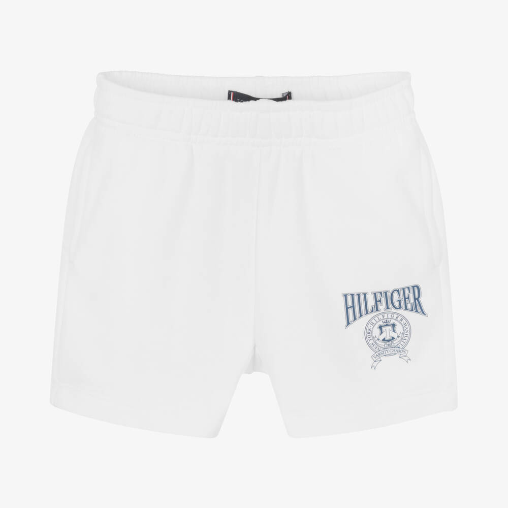 Sporty white cotton shorts for boys by American brand Tommy Hilfiger, made in comfortable, stretchy, sweatshirt jersey. The elasticated waistband has a useful, inner drawstring for a good fit and there are handy concealed pockets on the side seams. On the front is the designer's varsity logo in blue, and around the back on the pocket is a signature, embroidered logo flag. This item is made of at least 50% transitional cotton.