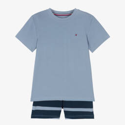 White and navy blue pyjamas for older boys by Tommy Hilfiger, made in soft cotton jersey. The long-sleeved top has a small embroidered flag logo on the chest and the coordinating trousers have an all-over flag logo print. They have a comfortable branded elasticated waistband and ribbed cuffs for a cosy finish.