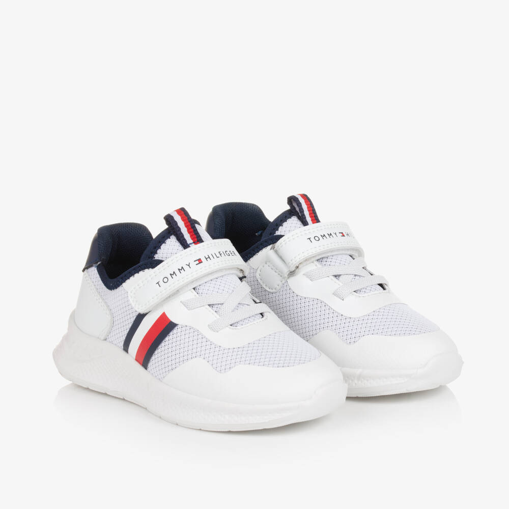 From Tommy Hilfiger, these white trainers for boys have both soft mesh and faux leather uppers. This sporty design has the brand's signature stripe detailing on the sides and tongue. Elasticated laces allow them to slip on easily and for a comfortable fit, they have a velcro strap stamped with the brand's distinctive logo. Lined in soft textile, they have lightly padded insoles and non-slip rubber outer soles. This item is made with at least 50% recycled materials.