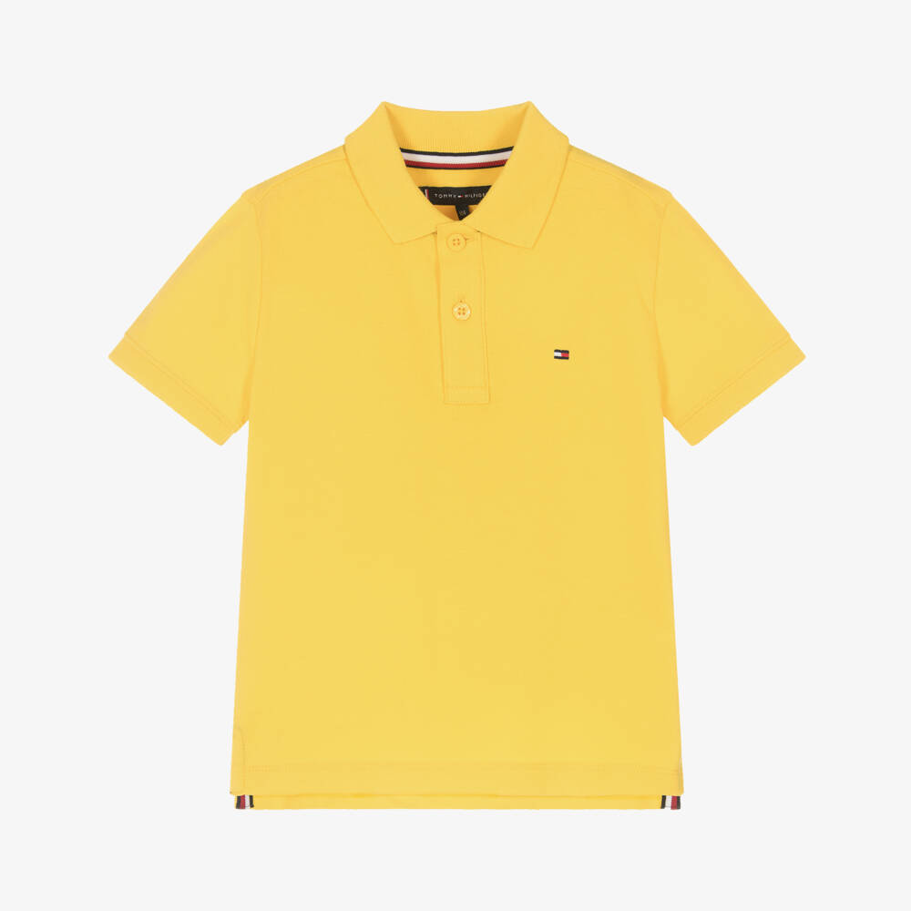 Classic yellow polo shirt for boys by Tommy Hilfiger, made in soft, breathable piqué with ribbed trims and a buttoned placket. For instant brand identity, it has the signature embroidered flag logo on the chest and tri-colour trims. This product is made with at least 95% organic cotton.