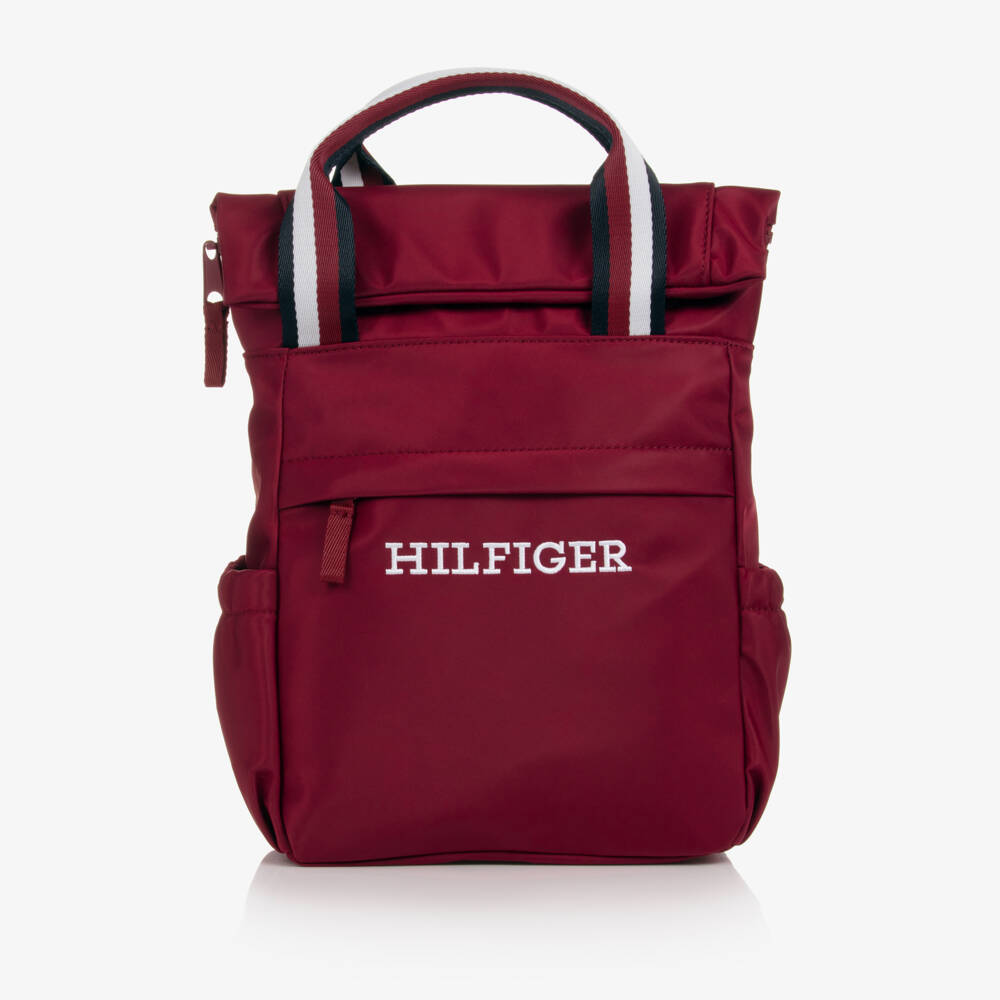 Burgundy red backpack for boys and girls by Tommy Hilfiger, made in soft, smooth recycled canvas. The main compartment has a zip fastening and a fold over flap with velcro tabs. There is a zipped pocket on the front with a large white embroidered logo and a slip pocket on each side. The shoulder straps are adjustable and patterned in the brand's classic tones of red, white and blue to match the carry handles.