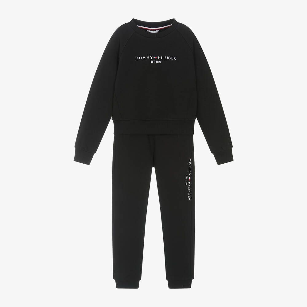 Black tracksuit for girls by Tommy Hilfiger, made in soft cotton blend jersey for comfortable wear. Casually styled with raglan sleeves and stretchy ribbed trims, the sweatshirt has an embroidered white logo on the front for instant designer appeal. The cuffed joggers have a matching logo printed down one leg, useful side seam pockets and a drawstring elasticated waistband for an ideal fit. Both pieces feature a small flag logo for a signature finish. This product is made with at least 20% recycled cotton.