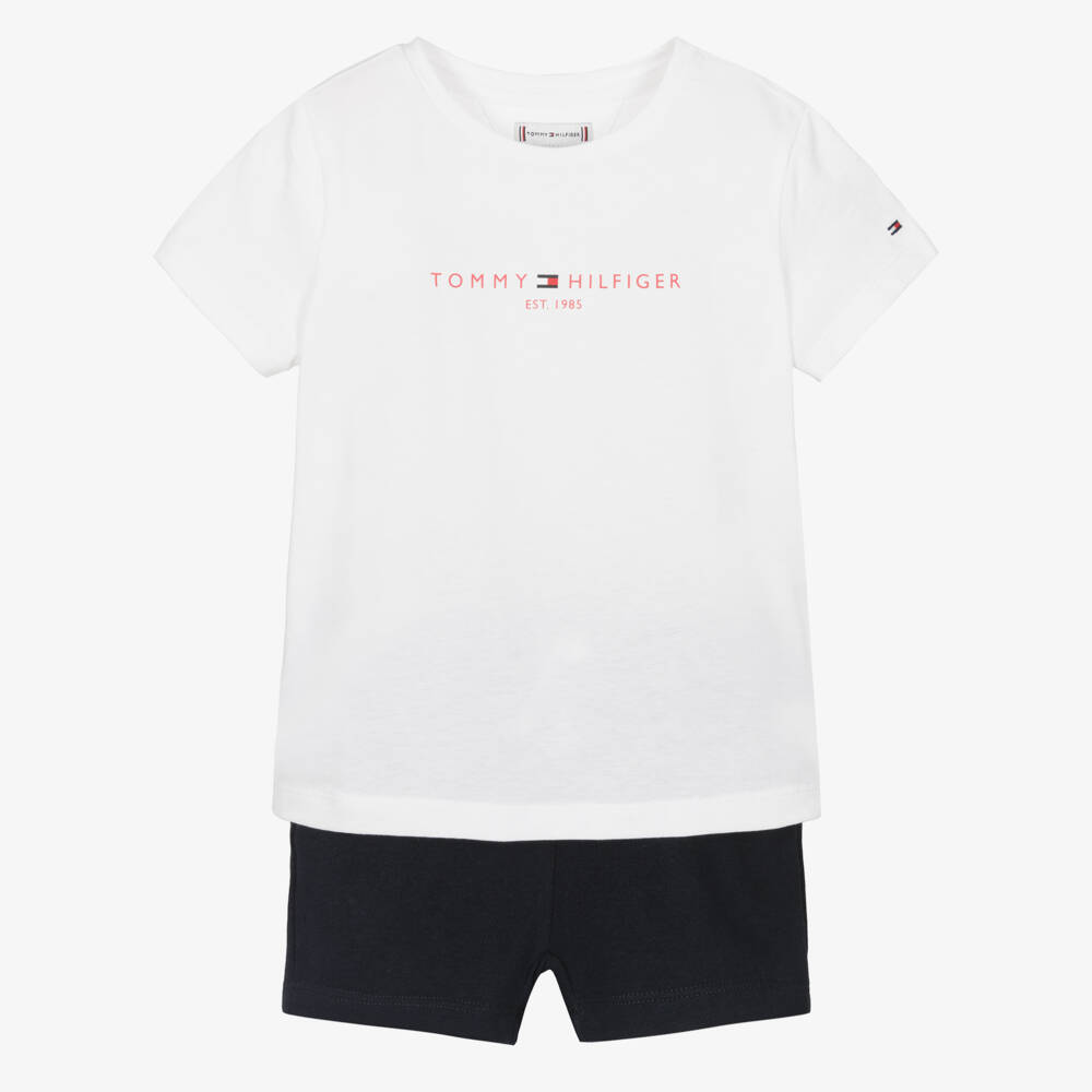 Sporty navy blue cotton shorts set for girls by American brand Tommy Hilfiger, made in comfortable jersey for relaxed days. The white T-shirt has a contrasting pink logo printed on the front, with the iconic embroidered flag logo on one sleeve. The navy blue shorts have a ribbed waistband with a white drawstring for a good fit and useful, jetted side pockets. They have an embroidered flag logo on one side.
