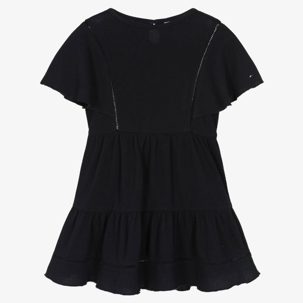 Pretty navy blue cotton dress for girls by American brand Tommy Hilfiger, made in comfortable, textured jersey. With ladder stitch detailing on the front, back and skirt, there is a signature embroidered flag logo on one of the flutter sleeves. The gathered, tiered skirt has an embroidered, monogram logo on one side and over-stitching on the hemline. The dress fastens with a single button around the back.