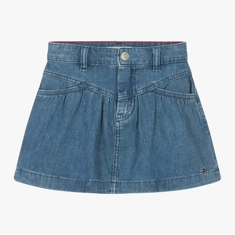 Girls mid-blue cotton denim skirt from American brand Tommy Hilfiger. Ideal for casual wear, this stylish skirt is slightly gathered for a fuller shape, with pockets on the front adding to the relaxed look. It fastens with a branded popper and zip and has an adjustable waistband for a comfortable fit. The brand's signature flag logo is embroidered just above the hem for a subtle designer finish.