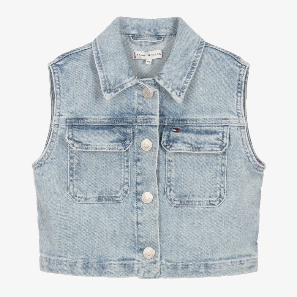 Sleeveless bleached blue denim jacket for girls from American brand, Tommy Hilfiger. This cool design has flap pockets on the chest and fastens with branded buttons. For a signature finish, it has the designer's flag logo embroidered on the front.