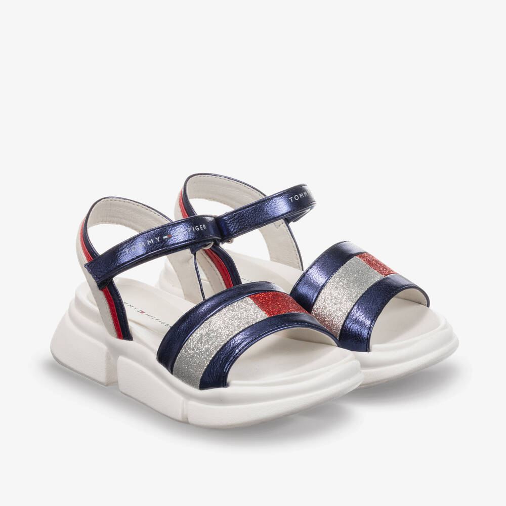 Girls logo sandals by Tommy Hilfiger, with a white rubber sole. They are made in red, blue and silver faux leather and fasten with a velcro strap across the ankle.