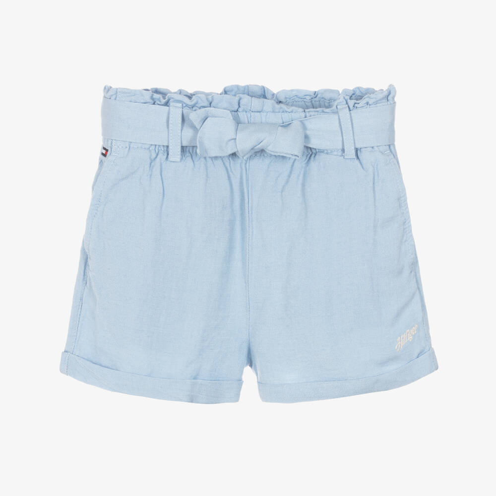 A chic and casual look for warmer days, these pale blue shorts for girls are from Tommy Hilfiger. Woven in a soft blend of linen and viscose, this lightweight design features a stylish tie belt and elasticated, ruffled waistband. Embroidered with a white logo above the turn-up cuff, they have further branding on the front and back pockets, including the signature flag logo.
