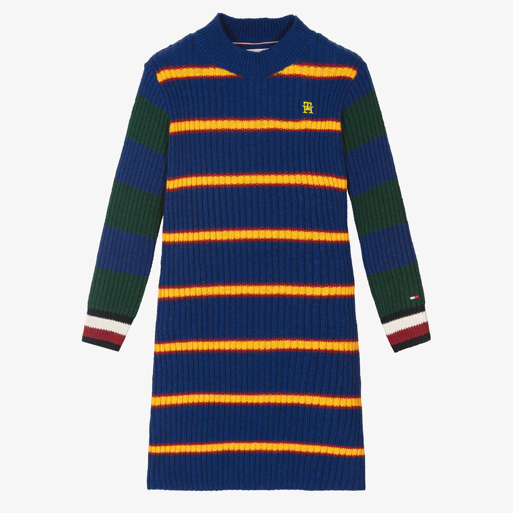 Stylish blue dress for girls by American label Tommy Hilfiger, in a varsity-inspired striped design. Achieve a cool, preppy look in this fitted dress, featuring logo embroideries on the chest and the cuffs. Knitted in a soft cotton and wool blend, the cuffs have an intarsia flag logo design to add extra designer appeal to this casual dress.
