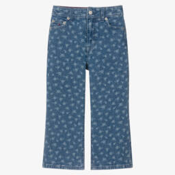 Girls stylish bootcut-flare jeans by Tomy Hilfiger, in a mid-blue vintage wash with very subtly distressed edges. The designer's embroidered iconic flag logos, branded silver rivets and jacron are featured in this classic five-pocket style.