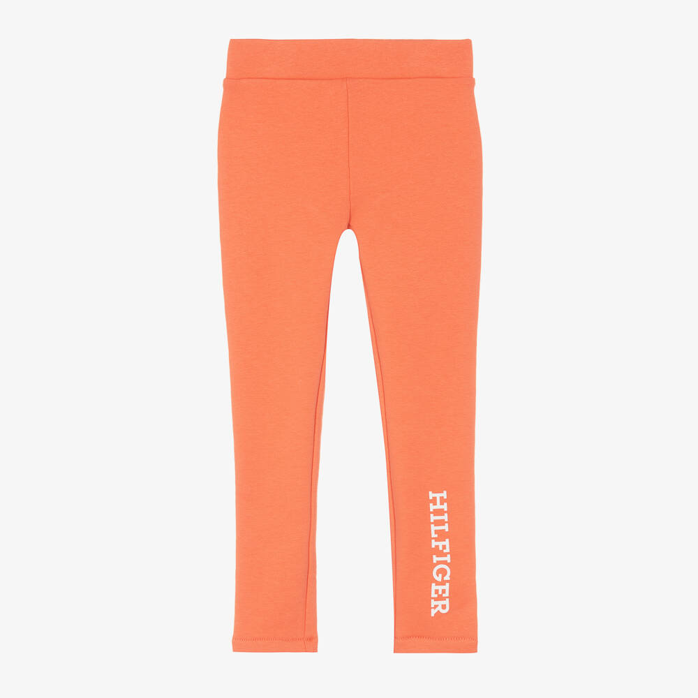 Coral pink leggings for girls by Tommy Hilfiger, made from a soft and stretchy cotton jersey blend. They have a bold white logo print on one leg and the brand's distinct flag logo embroidered on the back. The stretchy waistband provides a comfortable fit and ensures plenty of room for movement.