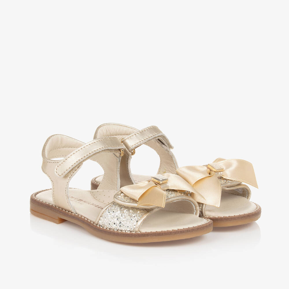 Lovely metallic gold sandals for girls by Tommy Hilfiger, made from smooth and supple leather. Standing out with sparkling silver glitter, the front velcro fastening has a satin bow decoration with a gold-tone TH monogram charm in the centre. A further strap secures neatly around the ankle for easy dressing and a contoured leather footbed provides comfort. A super flexible rubber outsole with neat topstitching and a small heel finishes the style.
