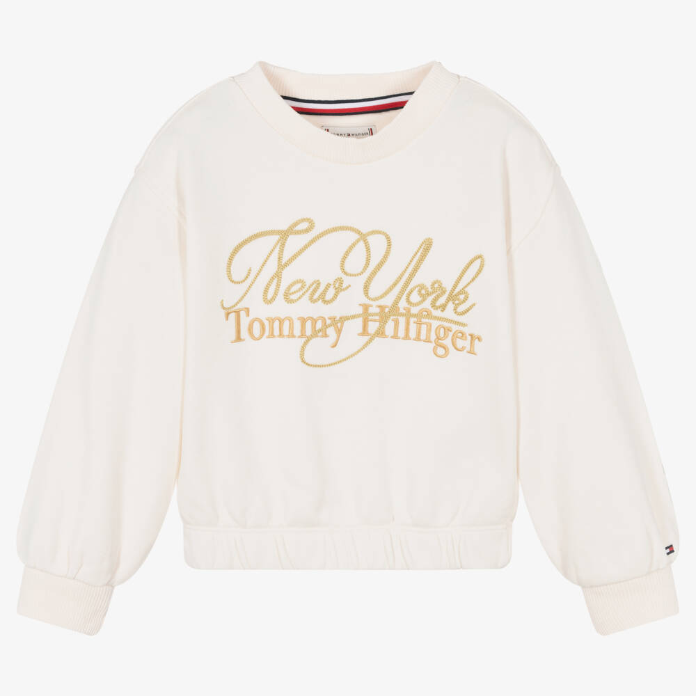 Ivory cotton sweatshirt for girls by American brand Tommy Hilfiger, made in stretchy jersey for all-day comfort. It has ribbed trims and an elasticated hemline for warmth, with a logo and 'New York' embroidered on the front in beige and gold. The designer's signature flag logo is embroidered on one cuff. The main material of this garment is made of at least 50% transitional cotton.