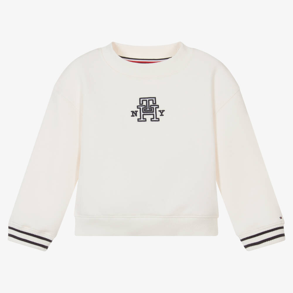 Ivory sweatshirt for girls by American brand Tommy Hilfiger, made from a soft cotton blend with a fleecy inside. Inspired by the label's heritage, this crew neck sweatshirt has a modern TH monogram appliqué on the front and an iconic flag motif embroidered on one sleeve. The ribbed trims, along with parallel navy blue stripes on the cuffs create a relaxed, casual look.