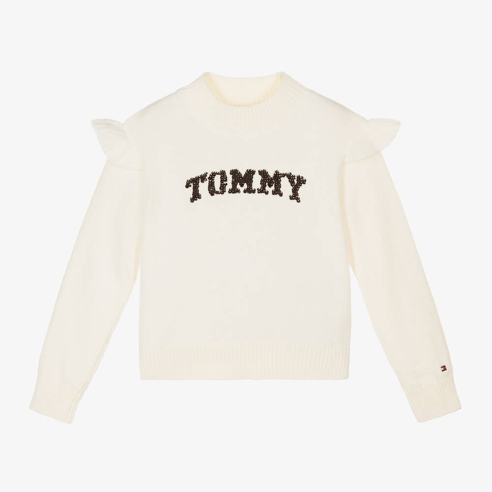 Super soft ivory knit sweater for girls by American brand Tommy Hilfiger. It has a large, reversible, sequinned logo across the front in shimmering grey and black. Made in a mid-weight cotton blend, there are neat, ribbed trims and matching, ribbed frills on the shoulders.