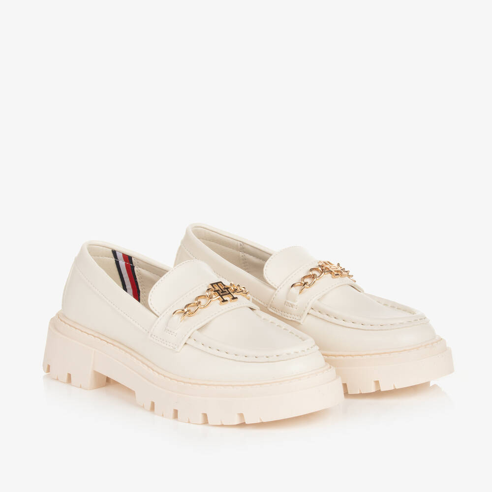 Chunky ivory loafers for girls by Tommy Hilfiger, made from soft faux leather. Both smart and stylish, they have a cushioned insole and a comfortable faux leather lining. Easy to slip on, this timeless style is complete with a gold-tone chain detail on the front with a modern TH monogram in the centre. The cleated, rubber sole provides additional tread on slippery surfaces. This item contains recycled materials.