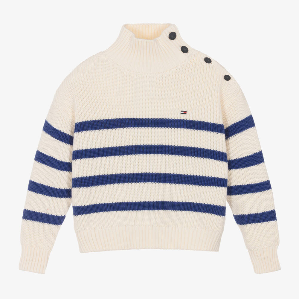 Cosy ivory and bright blue striped organic cotton sweater for girls by Tommy Hilfiger. This stylish, relaxed-fit knitwear piece has a high neck with smart, matt black crest buttons to fasten on one shoulder and the iconic logo flag embroidered on the chest.