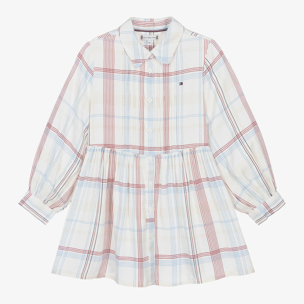 Girls ivory dress by Tommy Hilfiger, made from soft viscose fabric with a blue, beige and red check pattern. This shirt-style dress has a pointed collar and front button fastenings. There are pintuck pleats on the bodice and iconic flag embroidery on the chest for a branded look. The long sleeves have neat buttoned cuffs.