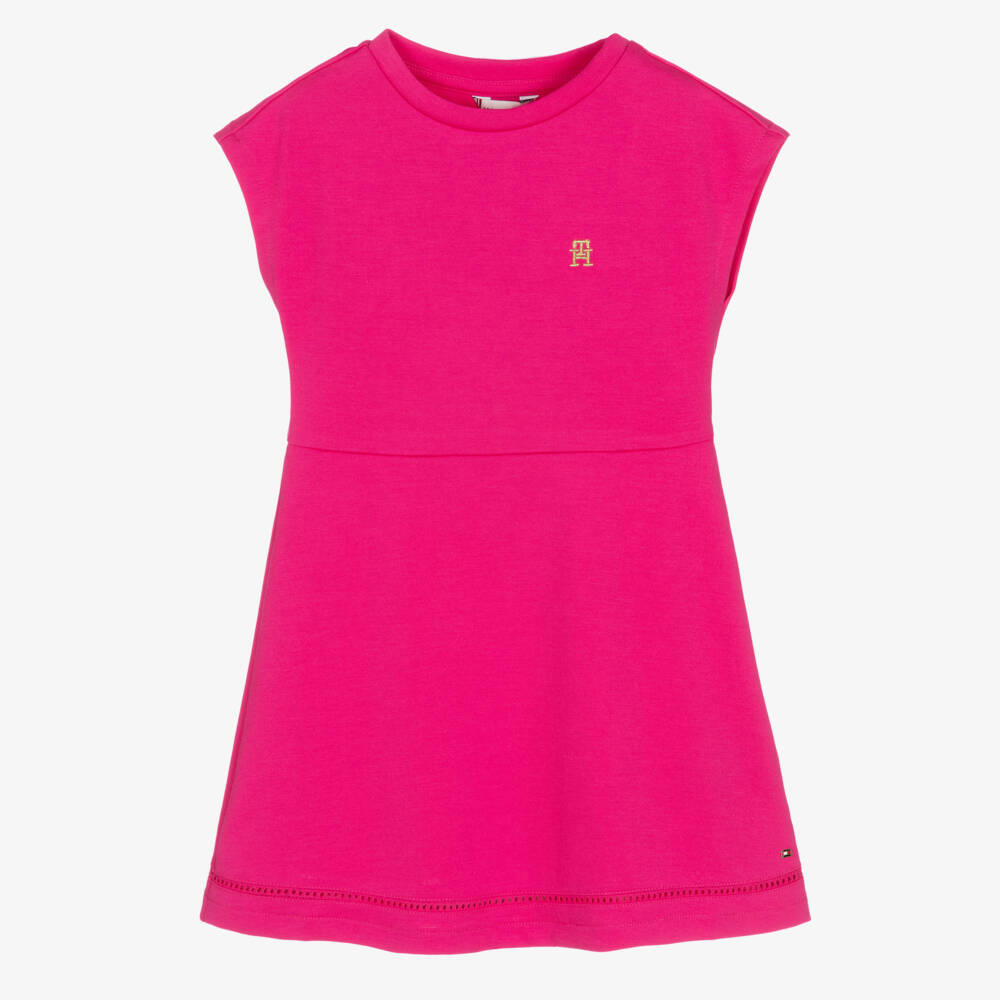 Mini-me magenta pink dress for girls by Tommy Hilfiger, with a sparkly gold TH Monogram embroidered on the chest. Soft and stretchy, the Milano jersey creates a stylish and streamlined silhouette, with cut-out lace detailing on the skirt and a metal flag logo tab on the hem.