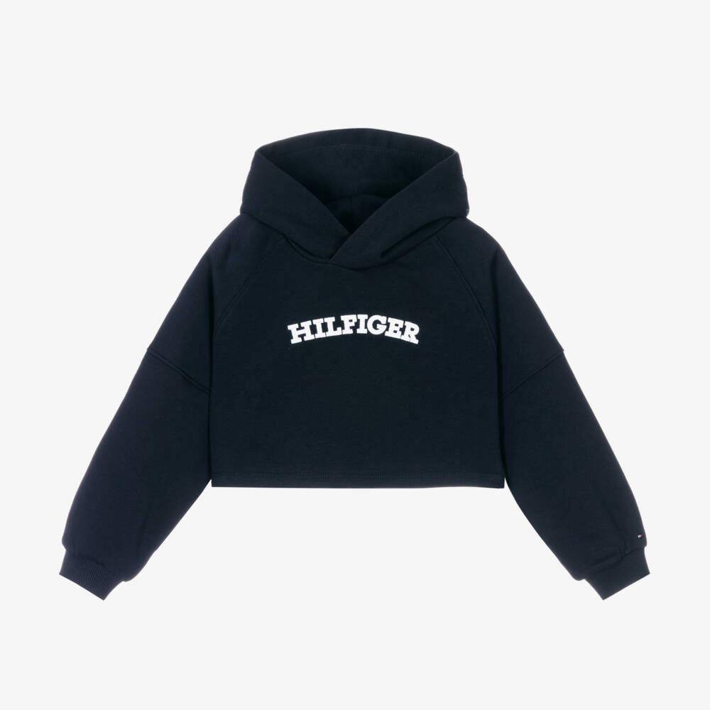 Navy blue boxy fit hooded sweatshirt for girls by American brand Tommy Hilfiger, made in comfortable cotton jersey. This slightly cropped style has the brand's bold white logo embroidered on the front, with the iconic flag logo embroidered by one of the neat, ribbed cuffs.