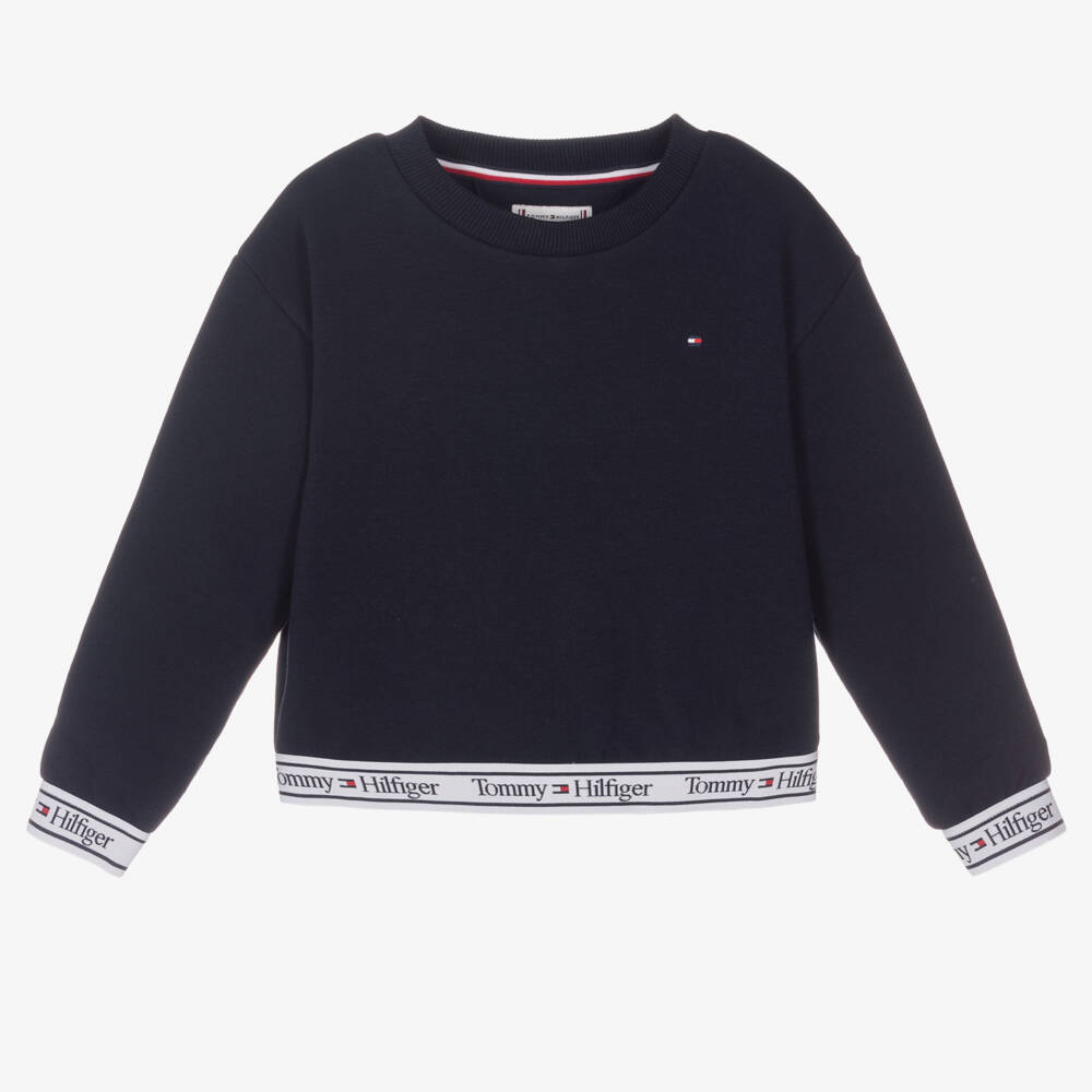 Easy to pair navy blue cotton sweatshirt for girls from Tommy Hilfiger. It has contrast white elasticated logo trims and the brand's signature flag logo embroidered on the front. It is made with at least 50% transitional cotton.