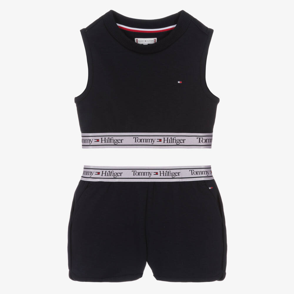 Navy blue shorts set for girls by American brand Tommy Hilfiger, with a sporty vibe. Made in a super soft, comfortable, viscose-blend jersey, both the cropped top and shorts have the signature flag logo embroidered on one side and elasticated logo trims. The top has a ribbed neckline and the shorts have jetted side pockets. This product is made with at least 50% FSC certified viscose.