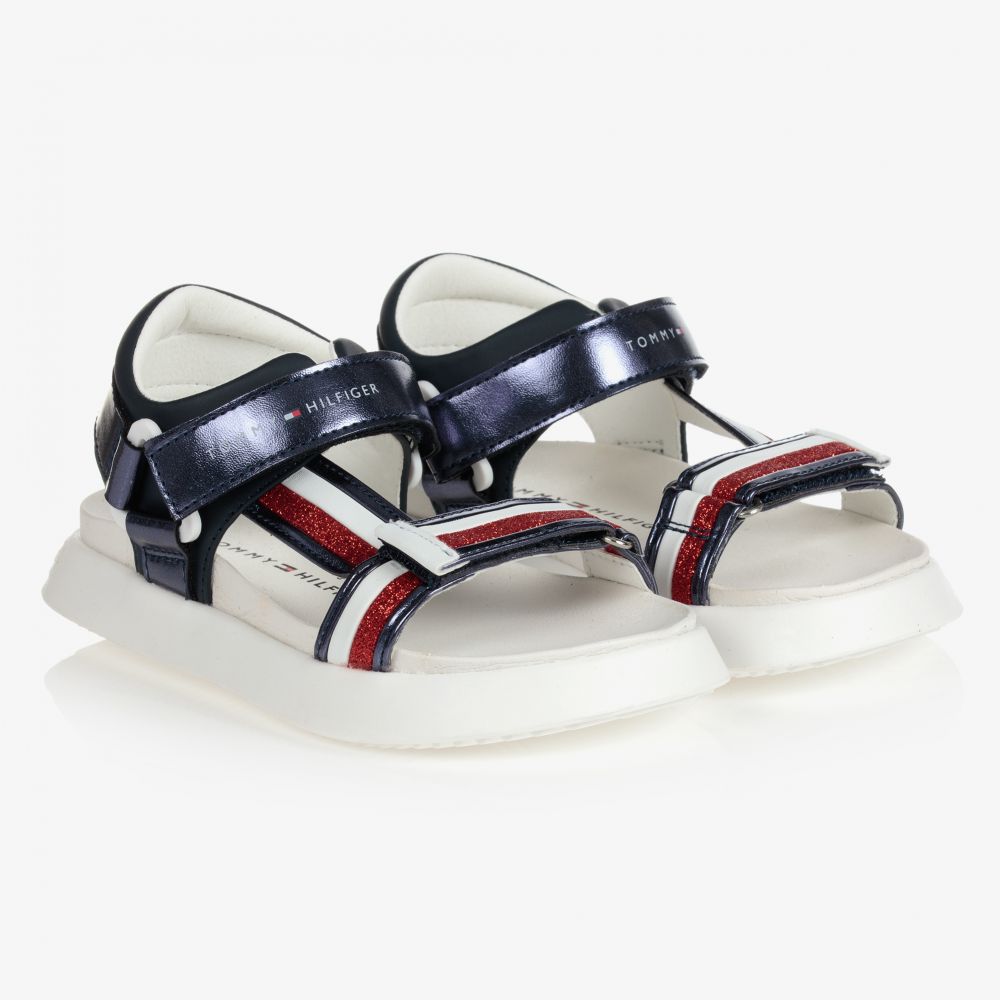 Metallic navy blue faux leather sandals for girls by Tommy Hilfiger, with white and glittery red trims. Lined in soft faux leather, these comfortable sandals have cushioned and shaped EVA insole and chunky white non-slip rubber sole. They fasten with velcro straps over the foot and on the logo branded ankle.
