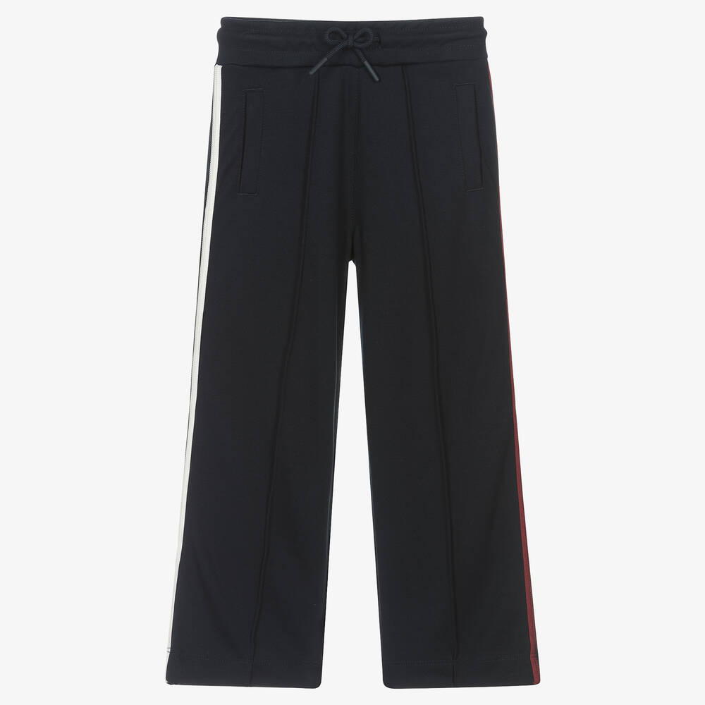 Navy blue viscose joggers for girls by Tommy Hilfiger, made from soft and stretchy Milano jersey. The brand's iconic global stripe trim is stitched down each leg for a sporty look, and embroidered on the back is their signature flag logo. There are two useful pockets and stitch seam detailing on the front, and an elasticated drawstring waist for a comfortable fit. This product is made with at least 50% FSC-certified viscose.
