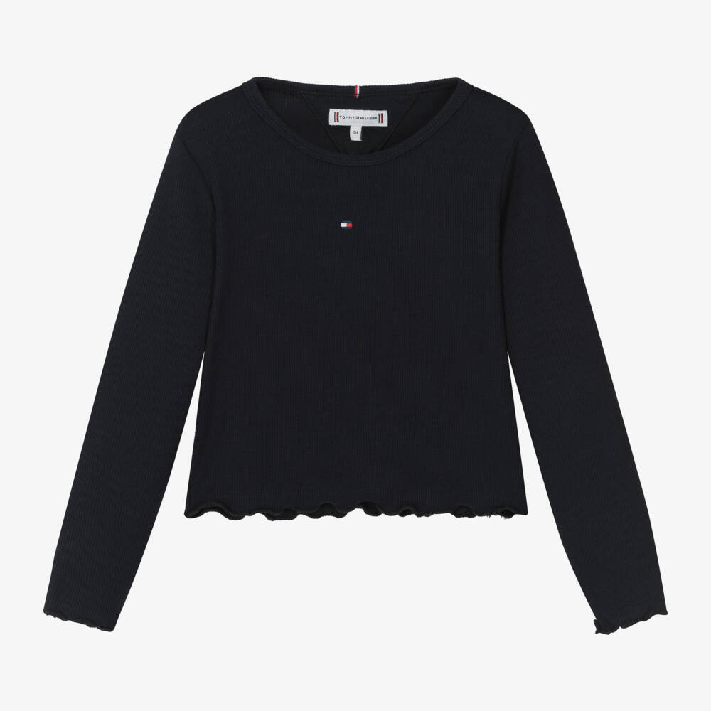 Navy blue top for girls by Tommy Hilfiger, made in a soft and stretchy ribbed cotton jersey. Simply styled, it is embroidered with the brand's iconic flag logo on the chest and matching tape trim on the back of the neck for subtle branded appeal. The hem and cuffs have a curly-edge finish for a lovely feminine touch.