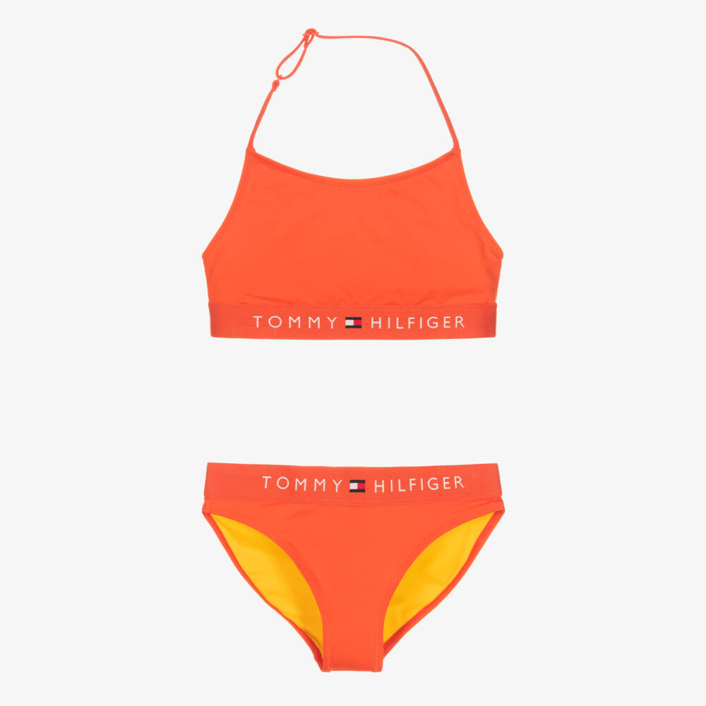 Orange bikini for girls by American brand Tommy Hilfiger, logo branded for a signature look. The halter neck strap is adjustable and there are elasticated trims for a snug fit. Silky soft and stretchy, this stylish two-piece is fully lined for comfort in bright yellow. The outer part of this garment is made with at least 50% recycled polyester.