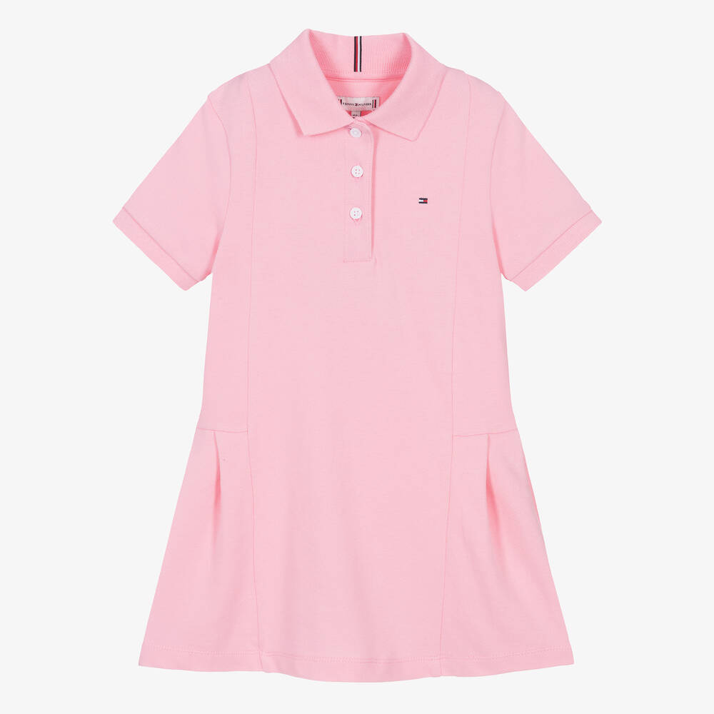 Pale pink polo dress for girls by Tommy Hilfiger, made in comfortable cotton piqué. Panelled on the front and back, it is styled with a dropped waist and a preppy pleated skirt. It has tricolour striped trims and the signature flag logo embroidered on the chest.
