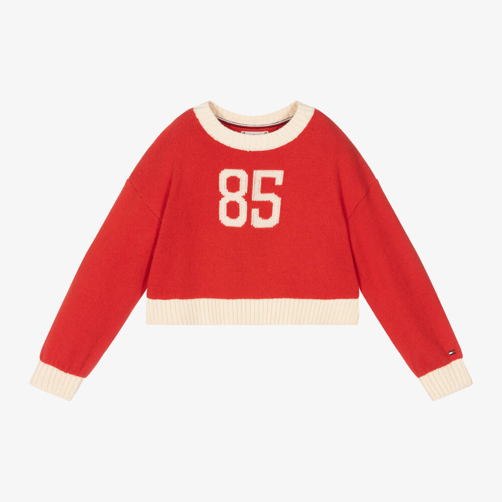 Stylish and casual for girls, a red Tommy Hilfiger jumper with contrast ivory detail. Knitted in a beautifully soft cotton and wool blend, this cropped style has a relaxed fit with dropped shoulder long sleeves. It is patterned with an '85' varsity-inspired logo and has the brand's signature flag motif embroidered on one sleeve.
