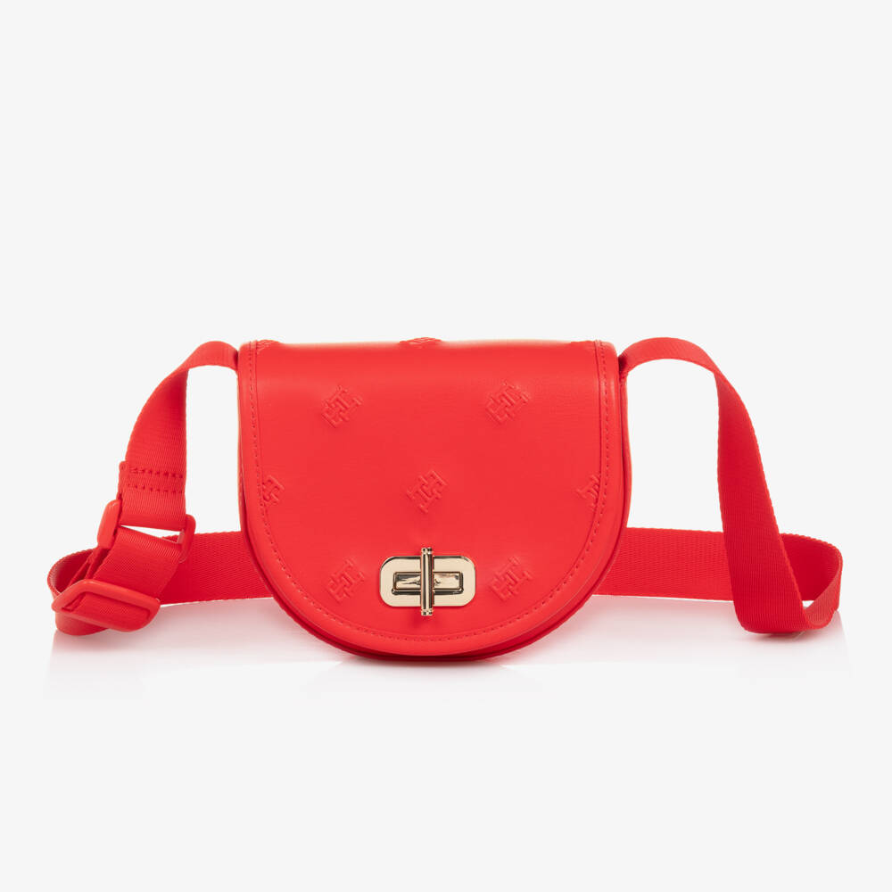 Red shoulder bag for girls by Tommy Hilfiger, made in soft faux leather. The inside has a silky lining and the front flap features embossed TH monogram logos and a gold metal twist lock fastening. The adjustable shoulder strap is made in soft canvas webbing and also gives the versatile option of wearing the bag across the body.