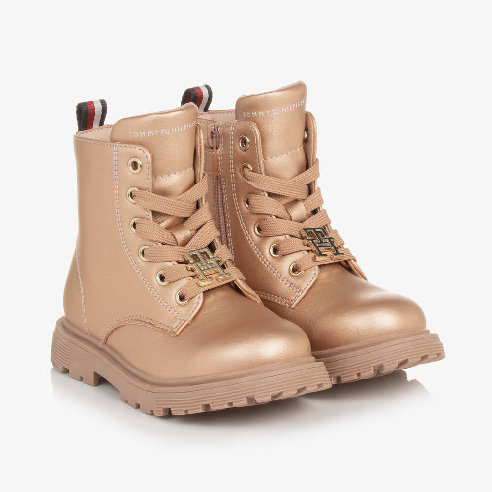 Shimmering, metallic rose gold faux leather ankle boots for girls by Tommy Hilfiger. Easy to wear, they have a comfortable, lightly padded, mesh lining and insole, with chunky, rubber outer soles providing good grip. The brand's logo is printed on the tongue with a signature flag pull tab on the back. They fasten with laces, which have a removable gold metal TH monogram logo charm and there is also a zip on the side to help with dressing. This item contains at least 50% recycled material.