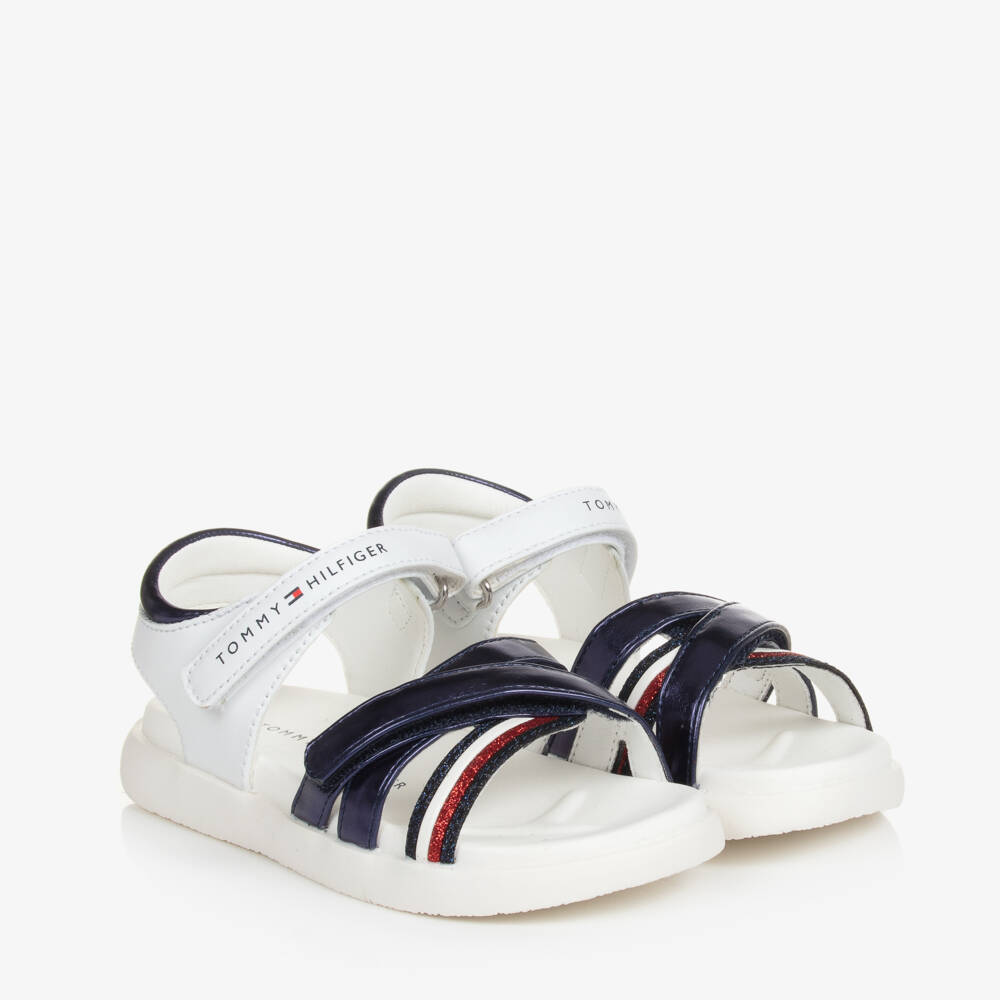 White and metallic blue sandals for younger girls from Tommy Hilfiger. They are made and lined in super-soft faux leather, with a cross-over velcro strap across the front and a branded ankle strap to help keep them secure on her feet. An unmistakable Tommy Hilfiger style, they have the American brand's signature details in sparkling glitter. The insole is lightly padded and the rubber outsole is treaded for good grip. These shoes are made using at least 50% recycled materials.